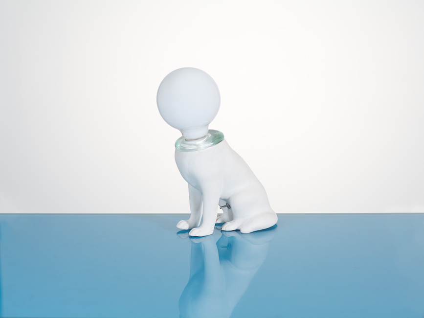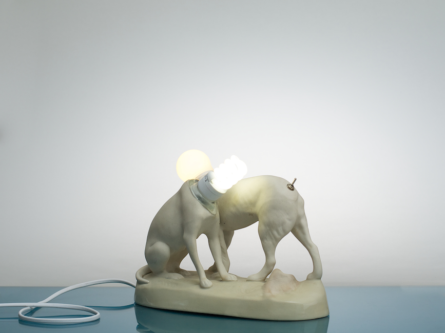 Die Lampe "Zeig mir dein Licht" besteht aus den Skulpturen eines Rehs und einer Hirschkuh. Beiden fehlt ein Kopf, der durch Lampen ersetzt wird. Es ist ein etwas brutaler Ansatz, und die Amputation von Fragmenten dieser ursprünglich kitschigen Porzellanfiguren provoziert die Zerstörung der üblichen Ästhetik.